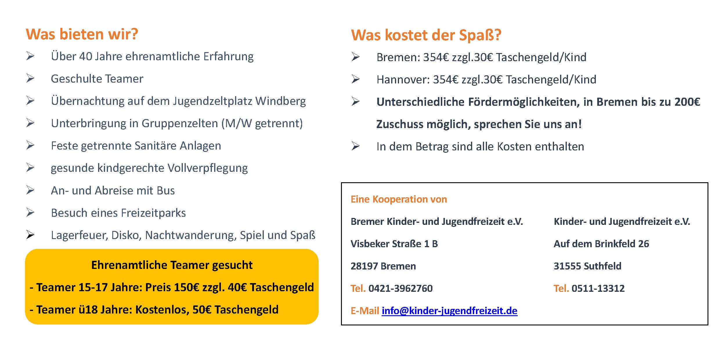 Dies gibt ihnen somit die Möglichkeit sich frühzeitig einen Platz in unserem Camp für ihr Kind zu sichern. Bitte beachten Sie, dass für eine Zuschussgewährung eine frühzeitige Anmeldung unbedingt notwendig ist. Erfahrungswerte zeigen, dass ein Zuschuss bei Anmeldung nach dem 30.3. häufig nicht mehr möglich ist oder für Sie (und uns) viel Lauferei und Warten mit sich bringt. Im Bremer Umland läuft die Beantragung von Zuschüssen über das zuständige Jugendamt – geben Sie dort bitte für Rückfragen zum Anbieter des Camps den „Kinder- und Jugendfreizeit e.V.“, mit Sven Schumacher als Ansprechpartner für Rückfragen an, mit der Handynummer 0176-13312111. Der Kinder- und Jugendfreizeit e.V. ist unser langjähriger Kooperationspartner – insbesondere für Kinder aus der Region Hannover.